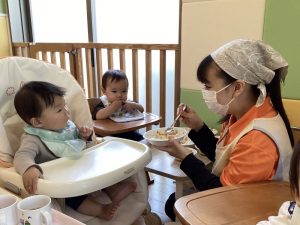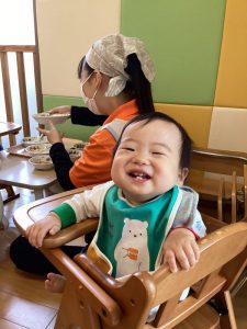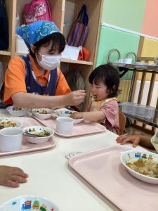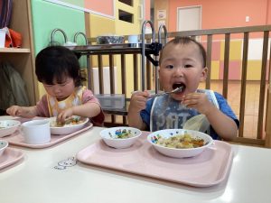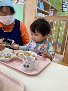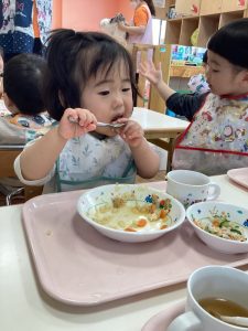 いちご組さん?のお友達は入園当初よりもスプーン?でご飯をすくうのが上手になり、今ではスプーンから食材が落ちないように自分で左手を添えながら食べている姿が見られますよ?