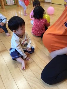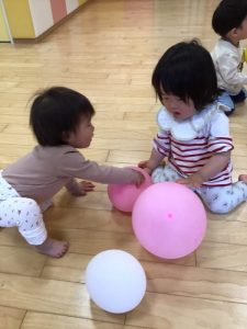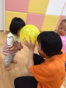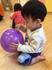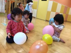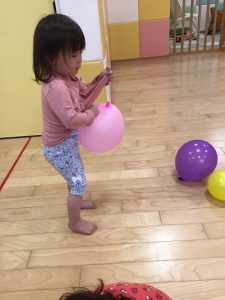 自分の好きな色の風船を見つけてポーンと飛ばしたり、ブンブンと振り回したりして思い思いに楽しむ子ども達です??
