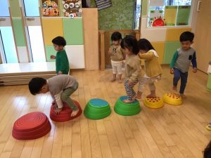 バランス感覚が必要不可欠な平均台ですが、りんご組さんになると1人でスタスタと渡り切ることが出来ますよ?