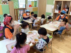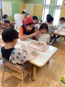 普段、野菜が得意ではない子も同じテーブル内のお友達が食べているのを見て一口頑張ろうとする姿が見られます☺️