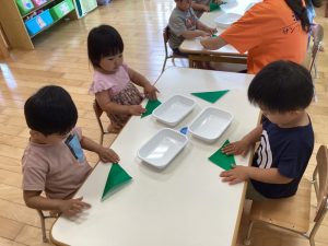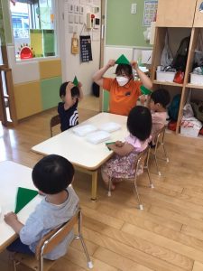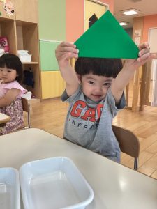 手でアイロンをして折り目をつけたり、角と角を合わせようとしたりなど、上手に形を作っていく子ども達?✨