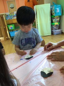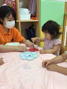いちご組さんは絵の具を使った製作が大好きなので、何が始まるかワクワクです!?