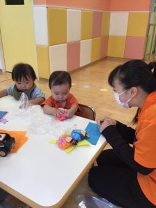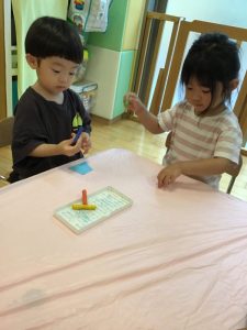 ピンク、オレンジ、青、紫があるから、先生と一緒にやってみようね?