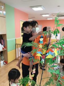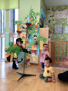 先生と一緒に飾り付けができると、ゆらゆらとゆれる飾りを見て嬉しそうな子どもたちでした?