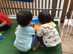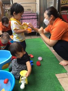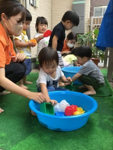 いちご組さんもお水をかけ合いっこして楽しんでいます???