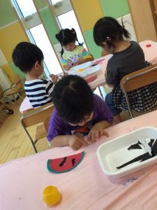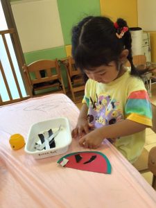 お次はスイカの模様と種に見立てた紙をちぎりを終えたら次は糊を付けていきます☺️☀️