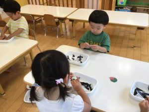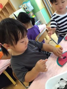 真剣に貼ることに集中して思わず目の距離が近くなってしまうお友達もいました?