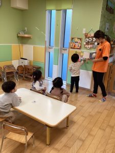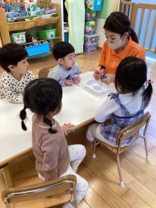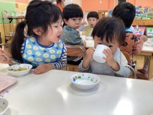 おやつの時間は、上のクラスのお友達が下のクラスのお友達のお世話をしてくれるので、先生達も大助かりです☺️💕