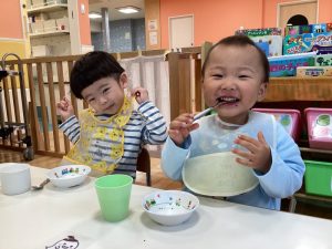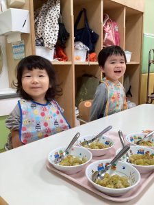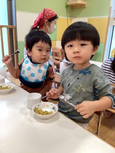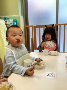 調理室からとってもいい匂いがしてきて、「おやつだー!!!!」と喜ぶ子ども達💓