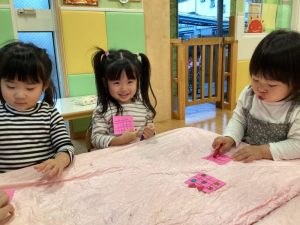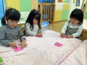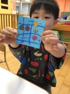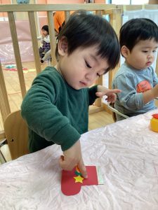 のりが手に沢山ついて、何度貼っても手から離れてくれないので困った表情😥も見られましたが、最後まで粘り強く頑張っていましたよ😊💮