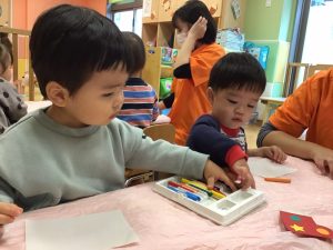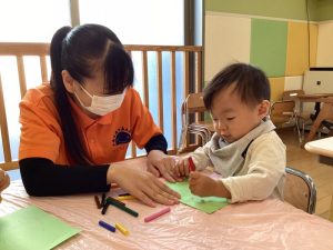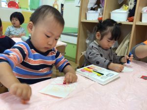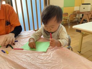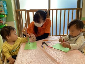 お絵描きが大好きないちご組さん、クレパスを両手に握りしめながら描いていますよ🎶