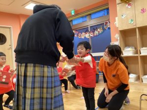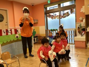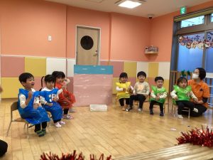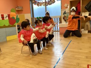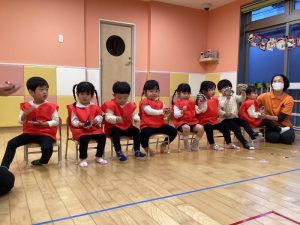しっかり鈴を握りしめて、シャンシャンとリズムよく鳴らしたり、足をどんどんと鳴らしたり、先生の方を見ながら合奏していました🎶