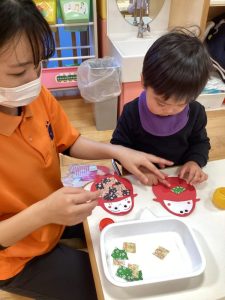 先生の見本を見比べながら「目はどこかな❓」「ほっぺたは目の下❓」などと呟き、貼る位置を自分で調整していましたよ⭐️