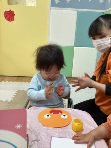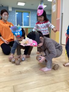 「♪履こう!履こう鬼のパンツ〜🩲」と保育者の真似もしながらも音に合わせて楽しく踊っていました😚