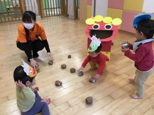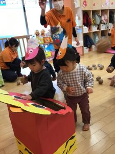 保育者と一緒に投げていると次第に1人でも力強く豆まきに参加することができました💪🏼💪🏼