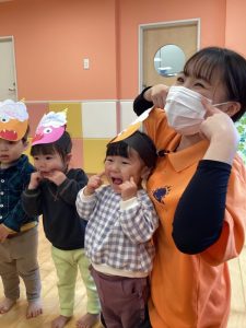 りんご組さん、いちご組さん、もも組さんに分かれてお面をつけて気合を入れていきますよ〜👹
