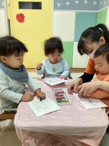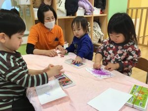 もも組さんも3人で仲良くクレヨンで鬼さんの髪の毛を作れました🥰