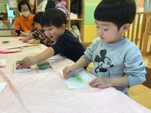 👦「みどりが好きなんだー💚」と大好きな色の鬼を思い思いに塗ってくれましたよ💕