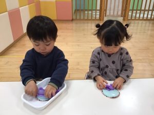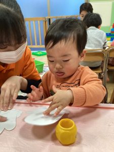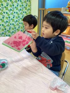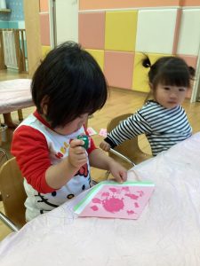 トントンとリズム良く押しているお友達や様々な方向からバランスを確認して押しているお友達もいて、スタンプ一つとっても面白い発見がありました☺️💕