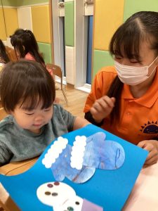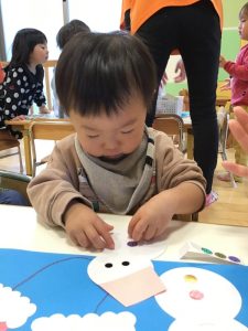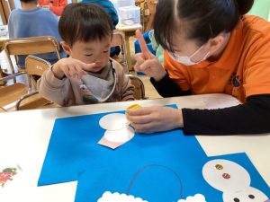 自分の好きな色の雪だるまを選んでお顔と身体にシールを貼っていきます😊