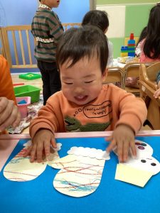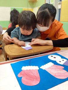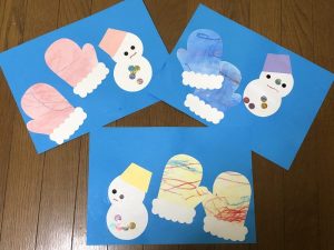 最後に完成した手袋と雪だるまを色画用紙に貼っていきます❕