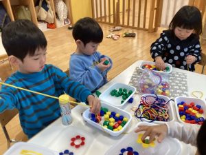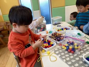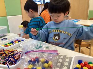 🪢紐通し、一回通らないからって負けないぞ👊✨と挑戦する様子が見られます😊💓