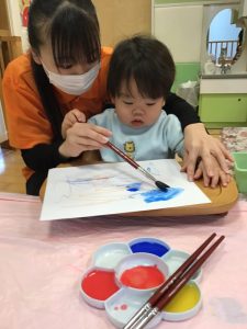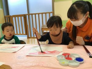 この日、初めて絵の具の筆を使った製作に取り組んだもも組さん✨