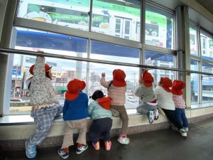 モノレールの連絡通路では、モノレールや電車を見たり駅のロータリーに入ってくる車やバス、パトカー🚓を見て楽しんでいますよ😊✨