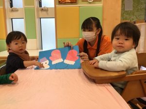 季節にちなんだ製作ということでもも組さんは雪だるまと手袋を作りました✨