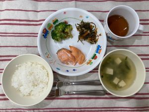 ごはん 味噌汁(小松菜・豆腐) 鮭の塩焼き 昆布の煮物 ブロッコリーのおかか和え