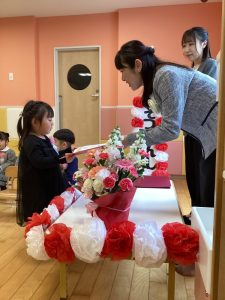 「かわいい〜💕」と言いながら、素敵なコサージュを先生につけてもらったら…✨
