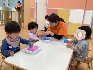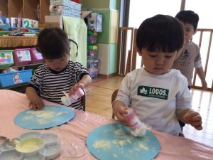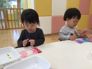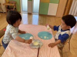 初めてのタンポに「これは何だろう?」と少し不思議そうにしていた新入園児さんもお友達の様子を見て自ら手を伸ばすと楽しそうにスタンピングしていました💕