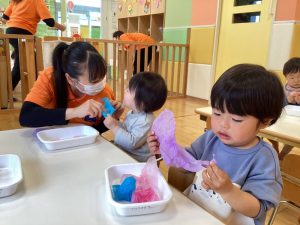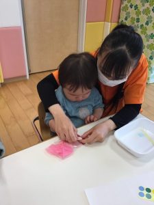 ぎゅっぎゅっ✨お花紙の感触が面白いね😂