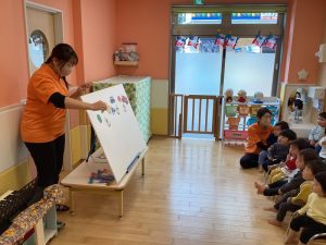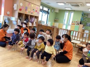 少し前までは、あっちこっち行ってしまっていた新入園児さんもいつもと違う雰囲気に何だろう?と不思議そうな表情をしながら椅子に座って先生のお話を聞いていました👀