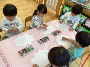 雲の形の画用紙にクレヨンでグルグル🌀好きな色を塗りました🖍️