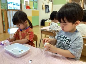 片栗粉と氷を使ってスライムを作り感触遊びをしました🤗