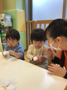 先生と一緒にクルクル丸めたら〜てるてる坊主の完成です🎶