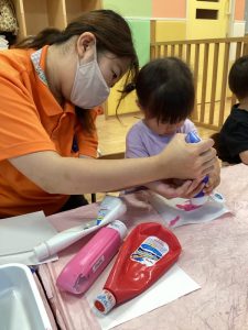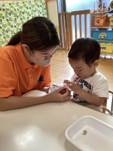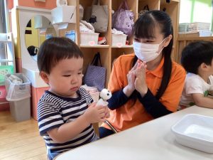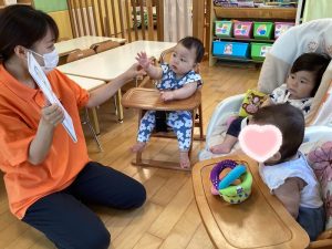 もも組さんのお友達の手をカエルさんの手に見立てます🖐️💕💕