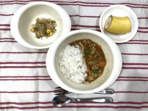 ごはん カレーシチュー 三色和え バナナ