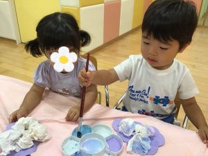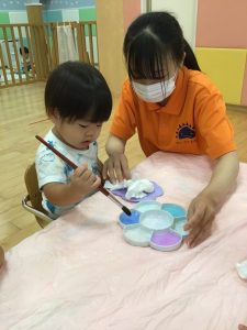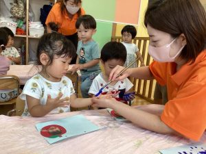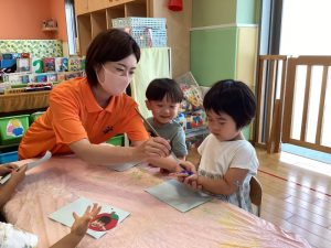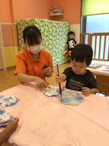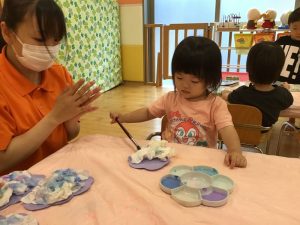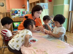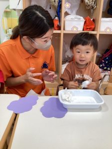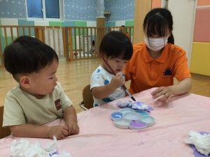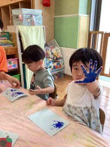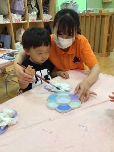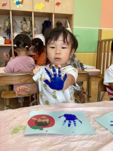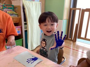 🙋‍♀️先生と一緒に手のひらに絵の具をつけるよ👐✨