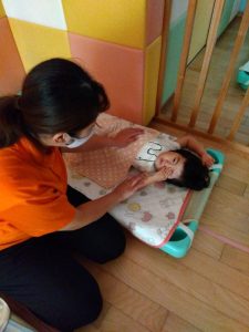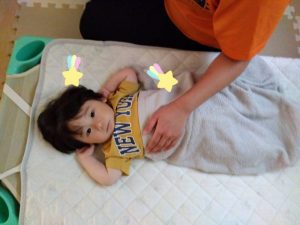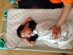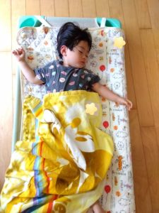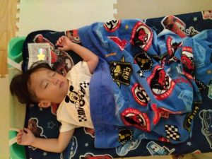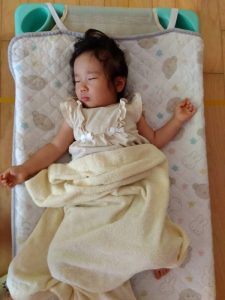 興奮して最初は眠れない子も、オルゴールの音楽と先生のトントンで心が落ち着いていき、だんだんとまぶたが重くなり、他のお友達のスースーの寝息も手伝って、、、