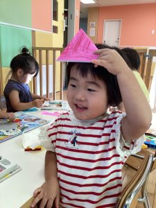 👧先生みてみて〜❤️私は帽子を作ったの👒😊
