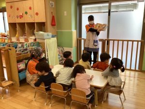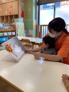 最初に様々な種類のきのこが登場する「いろいろきのこ」の絵本を読み聞かせしました📚
