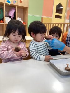 最初は見慣れないきのこになんだろう?と不思議そうにしていた子もお友達が楽しそうに触る姿を見て、ゆっくりそーっと手を伸ばしていましたよ✨