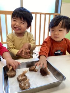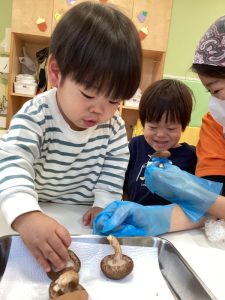 絵本にも出てきた「生しいたけ」を使うことを伝えるとワクワクが止まらない子どもたち😊