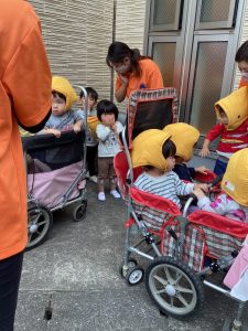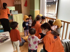 防災頭巾を被るのに躊躇していた子も今では「くださ〜い」と自分から被ってくれるようになりました😉✌️
