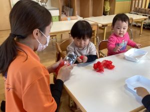 次は、クリスマスらしい赤い花紙をクシャクシャにして袋に入れます🖐️