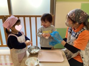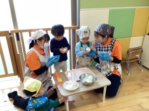今回、いちご組さんは初めてエプロンと三角巾を身に付けておにぎり作りに挑戦しました🍙