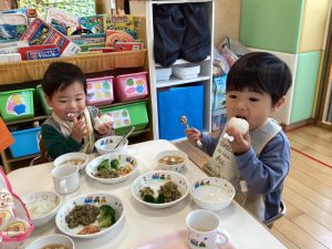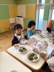👩🏻「お給食が楽しみだね💗」