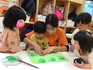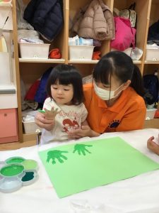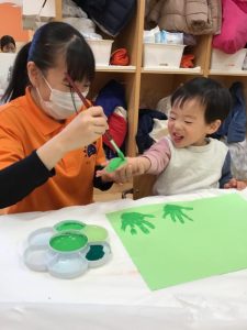 最初は緑色の絵の具で手形をとっていきます🖌️